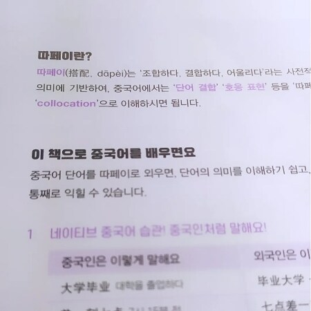 중국어뿐 아니라 외국어 공부를 할 때 영어의 경우는 연어라고 해서 collocation take care of /take charge of 이런 식으로 연어라는 개념이 있는데 단어를 단어 개별적으로 배우게 되면 단어 조합을 했을 때 틀리지는 않지만 잘 쓰지 않는 단어가 되기 때문에 의사소통에서 전달하고자 하는 의미가 제대로 전달되지 않을 수 있어요.