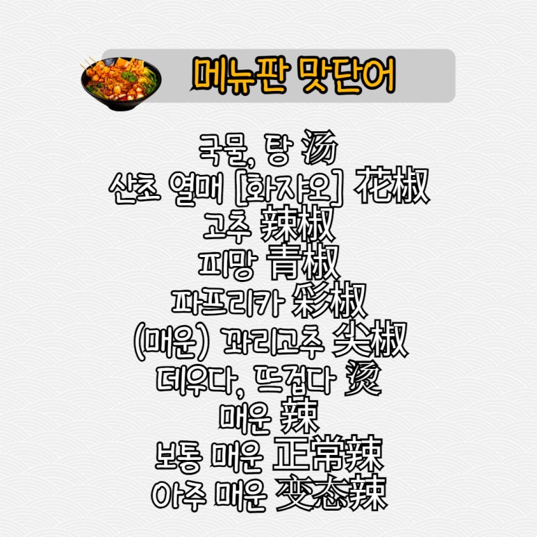 | [중국어 어휘] "훠궈 탕 종류🔥" 중국어로 배우기!📝 (4) | 2025.08.27 |