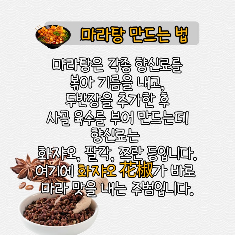 마라탕은 각종 향신료를 볶아 기름을 내고, 두반장을 추가한 후 사골 육수를 부어 만드는데, 향신료는 화쟈오 花椒 huãjião, 팔각 八角 bãjiâo, 쯔란 孜然 zårán 등입니다. 여기서 화쟈오가 바로 마라 맛을 내는 주범입니다. 한의원에 가면 구할 수 있는 소화제 환약 정도의 크기로, 색에 따라 붉은색인 홍화쟈오红花椒 hónghuãjião와 녹색인 뤼화쟈오绿花椒 lÛhuãjião가 있어요. 이중에 뤼화쟈오가 더 마라한 맛이 강하다 하여 마쟈오麻椒 májião라고 부르기도 합니다.