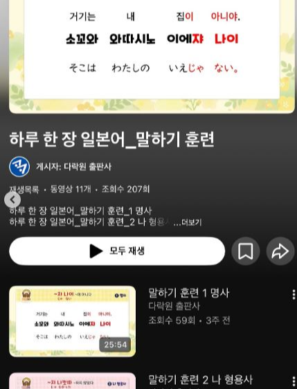 ・표지의 QR코드 스캔-동영상으로 들어가면 총 5시간 30분 분량의 말하기 훈련 영상을 볼 수 있다. 한글 음성도 함께 나오므로 그냥 틀어놓고 따라하기만 해도 저절로 일본어가 익혀진다.